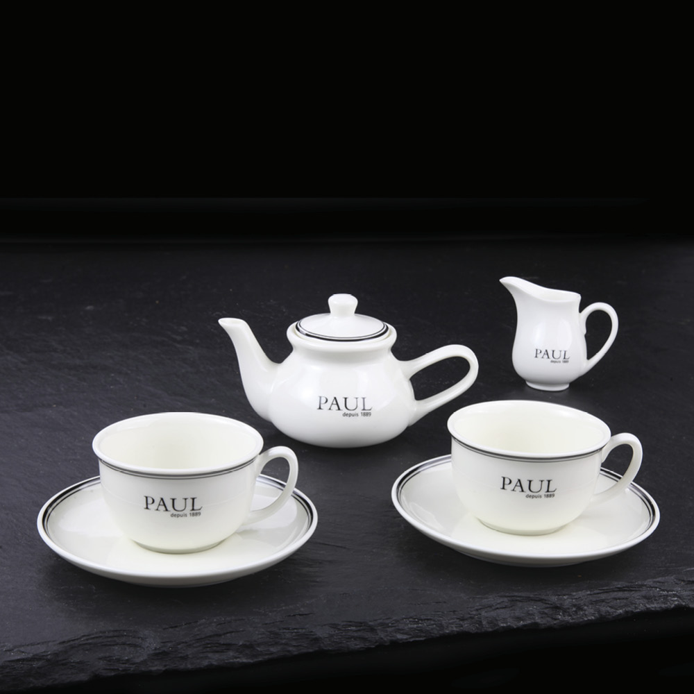 Krásná čajová sada – 2 šálky o objemu 240ml s podšálky, konvička na čaj o objemu 400ml a mléčenka.