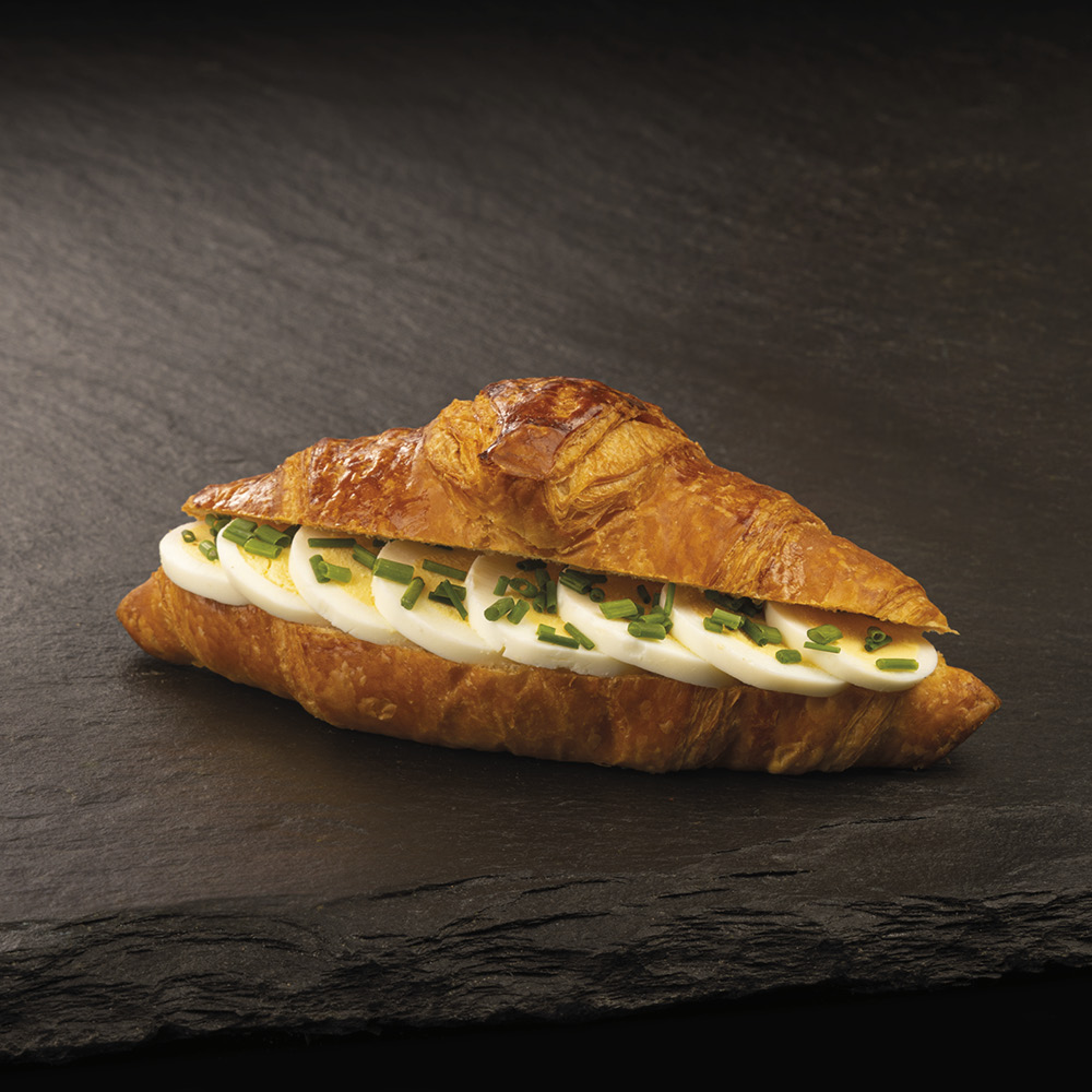 Croissant (56%)/pšeničná mouka, máslo, pitná voda, krystalový cukr, potravinářské droždí, jedlá sůl, zlepšující přípravek (pšeničný lepek, zahušťovadlo: guma guar E412, pšeničná mouka, emulgátor: glycerol a kyselina diacetylvinnou Estery mono a diglyceridů E472e, anitoxidant: kyselina askorbová E300, enzymy (amylázy a xylanázy), vaječná melanž (pasterizovaná slepičí vejce bez skořápky - 93%, pitná voda, konzervační látka: sorban draselný E202, regulátor kyselosti: kyselina citronová E330)/, vejce (32,5%)(slepičí vařená vejce z nálevu, složení nálevu - pitná voda, jedlá sůl, regulátor kyselosti: kyselina citronová E330, kyselina octová E260, kyselina mléčná E270), majonéza (9,3%)((obsah tuku 50%) řepkový olej, pitná voda, pasterované vaječné žloutky, cukr, modifikovaný kukuřičný škrob, ocet kvasný lihový, jedlá sůl, hořčičné semeno, směs koření, zahušťovadla: xanthan E415, guma guar E412, konzervant: kyselina sorbová E200, regulátor kyselosti: kyselina citronová E330, barvivo: beta karoten E160a(ii), antioxidant: ethylendiamintetraacetát vápenato-disodný E385, aroma)), pažitka (1,5%).
