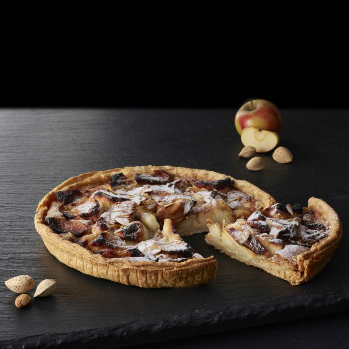 Jablečný koláč s mandlemi nadchne malé i velké. Vzali jsme si to nejlepší z tradičního receptu a nabízíme Vám opravdovou pochoutku. Celé čtvrtky lehce nakyslých jablek odrůdy Boskoop kontrastují s jemností mandlí, bohatou chutí krému a křupavostí máslového listového těsta. Neváhejte koláč ohřát a podávat s vanilkovou zmrzlinou či zakysanou smetanou. Koláč je vhodný pro 8 osob.