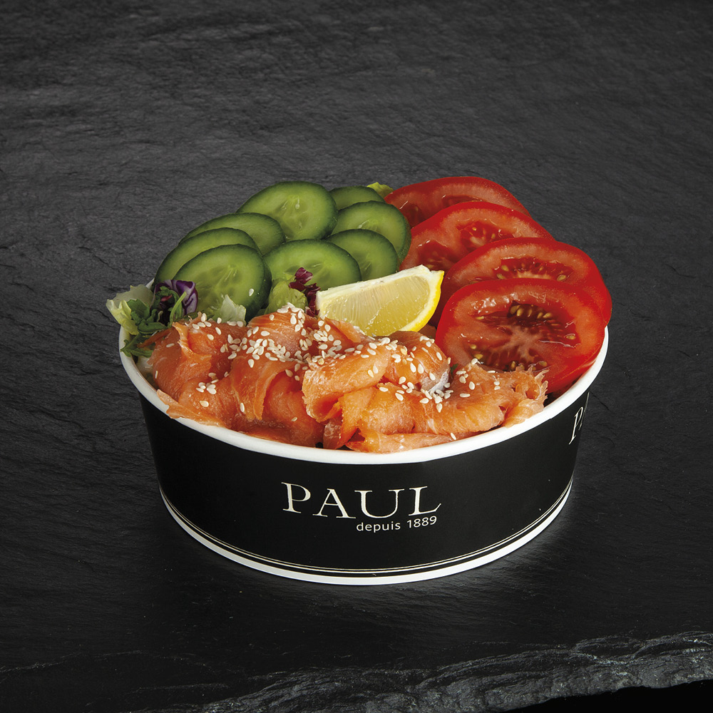 Mix salátu v různém poměru (43,5%) (Little Gem, ledový salát, čínské zelí, červené zelí, radicchio, rukola), uzený losos (20%)(losos ryba, jedlá sůl), rajčata (16,8%), salátová okurka (10%), citron, sezam.