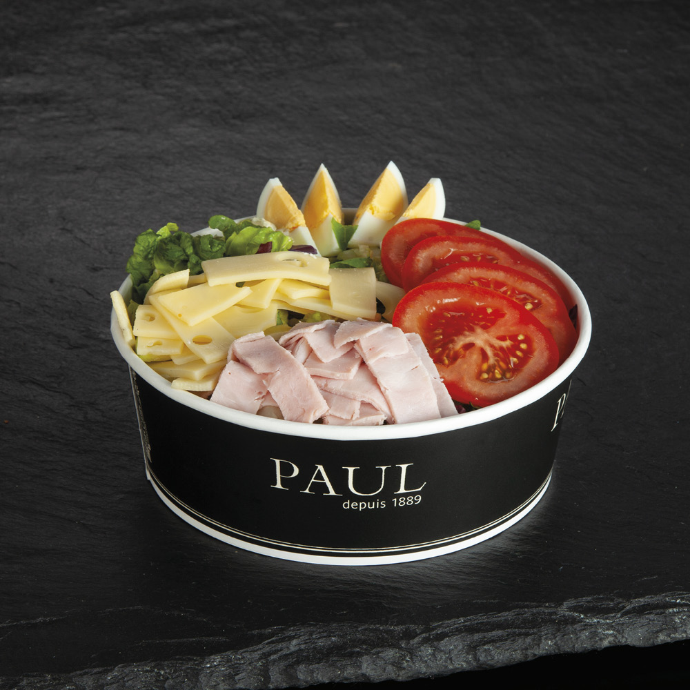 Mix salátů v různém poměru (42,4%)(Little Gem, ledový salát, čínské zelí, červené zelí, radicchio, rukola), rajčata (21,5%), vejce (16,3%)((vařená vejce, nálev (pitná voda, jedlá sůl, regulátor kyselosti: kyselina citronová, konzervant: benzoan sodný)), šunka (13%)(vepřová kýta, pitná voda, jedlá sůl, stabilizátory: difosforečnany E450, dusitan sodný E250, glukózový sirup, antioxidant: askorban sodný E301, aroma - výluh z pepře. Obsah čisté svalové bílkoviny min. 16%, šunka kategorie nejvyšší jakosti.), sýr ementál (6,5%)(pasterované mléko, jedlá sůl, mléčné kultury, živočišné syřidlo, tuk v sušině 45%, sušina 60%).